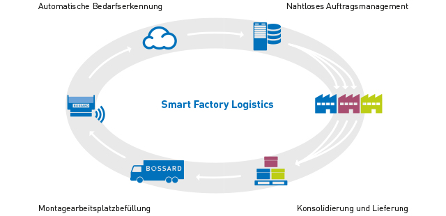 - Bossard vereint den Güterstrom und erstellt eine Sammelrechnung. Die Lieferung erfolgt entweder an den Verbrauchsort oder den Wareneingang.